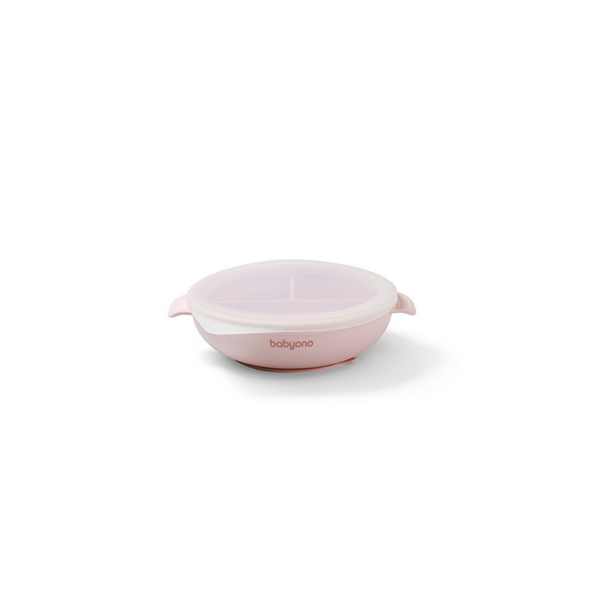 Silikonový talíř s přísavkou a víčkem babyono růžová
